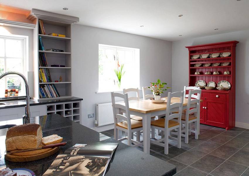 Использование таких полок призвано создать на кухне ауру гостеприимства, а также образ хозяйки, которая любит и часто готовит.