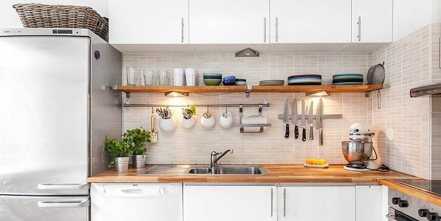 Exclamation ВНИМАНИЕ: светлая мебель в северных интерьерах часто оттеняется темной столешницей из натуральной древесины. Возможно, вам также будет интересно ознакомиться со стаьями на тему интерьер маленькой кухни в скандинавском стиле, а также скандинавский стиль в интерьере квартиры