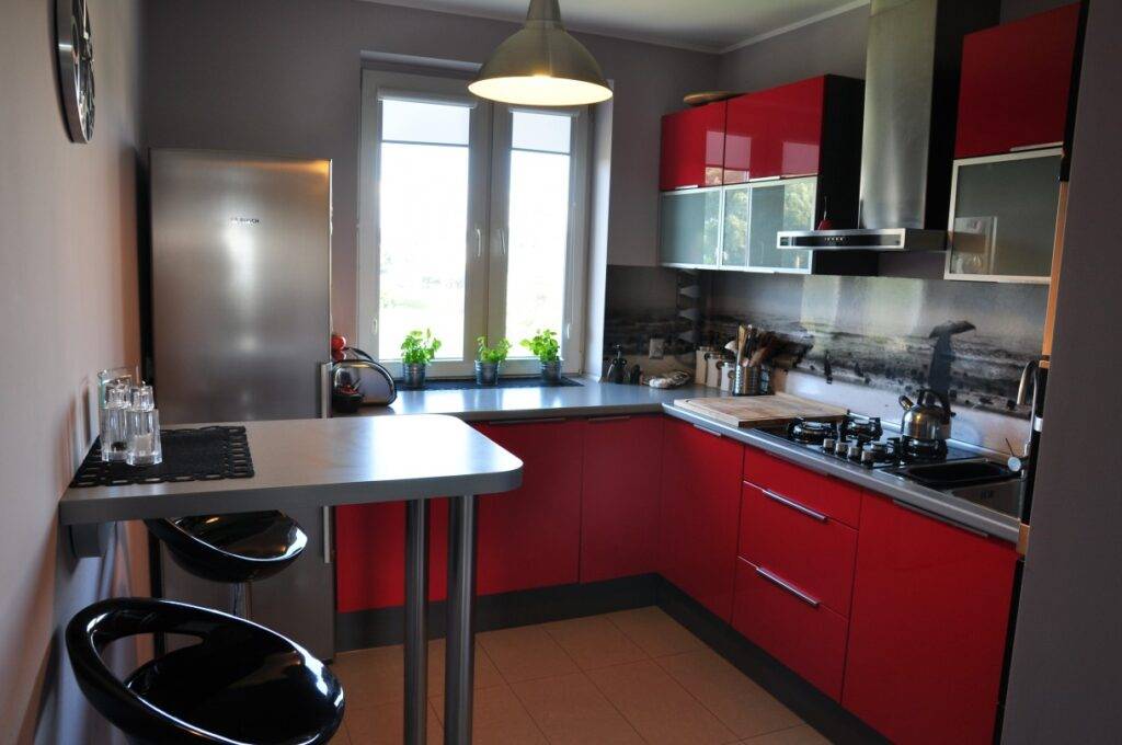 Красная мебель отлично смотрится на фоне ярких стен. Интерьер полон света и в то же время выразителен и эффектен. Вы можете играть с цветами по своему желанию. Красная кухня хорошо сочетается с белоснежным фарфором. Изысканные аксессуары красиво разместятся на рубиновых полках.