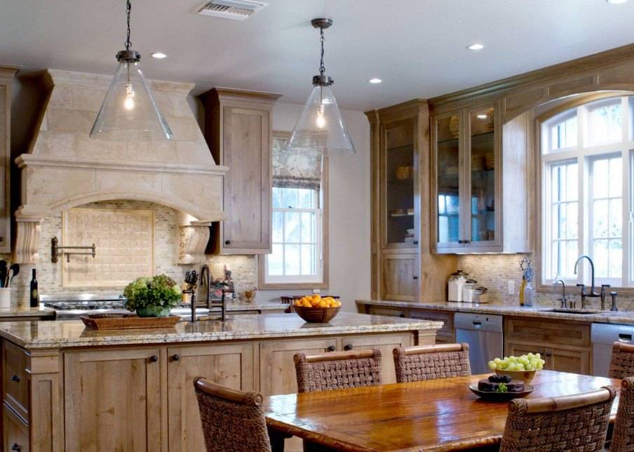 Не всегда можно позволить себе длинный стол в обеденной зоне, отмечающий центром провансальской кухни. Решением этой проблемы часто оказывается остров, который одновременно выступает в качестве рабочего пространства и места для хранения. Столешницы из натурального камня являются эффективным дополнением провансальского стиля на кухне. Они характеризуются не только исключительной декоративностью, но и высокой прочностью. Бывают двух вариантов: матовые и полированные.