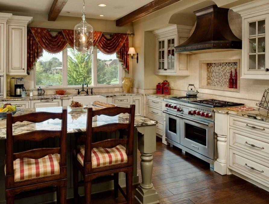 Для драпировки окон кухни в французском стиле используют классические тяжелые шторы и тюль