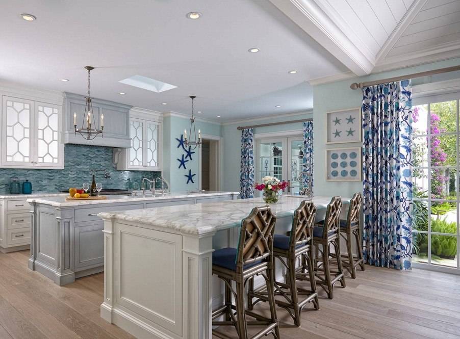 Голубую палитру очень часто можно видеть в кухнях, оформленных в стиле прованс. Зачастую голубые оттенки используются в отделке стен, мебельных фасадах и декоративных элементах.