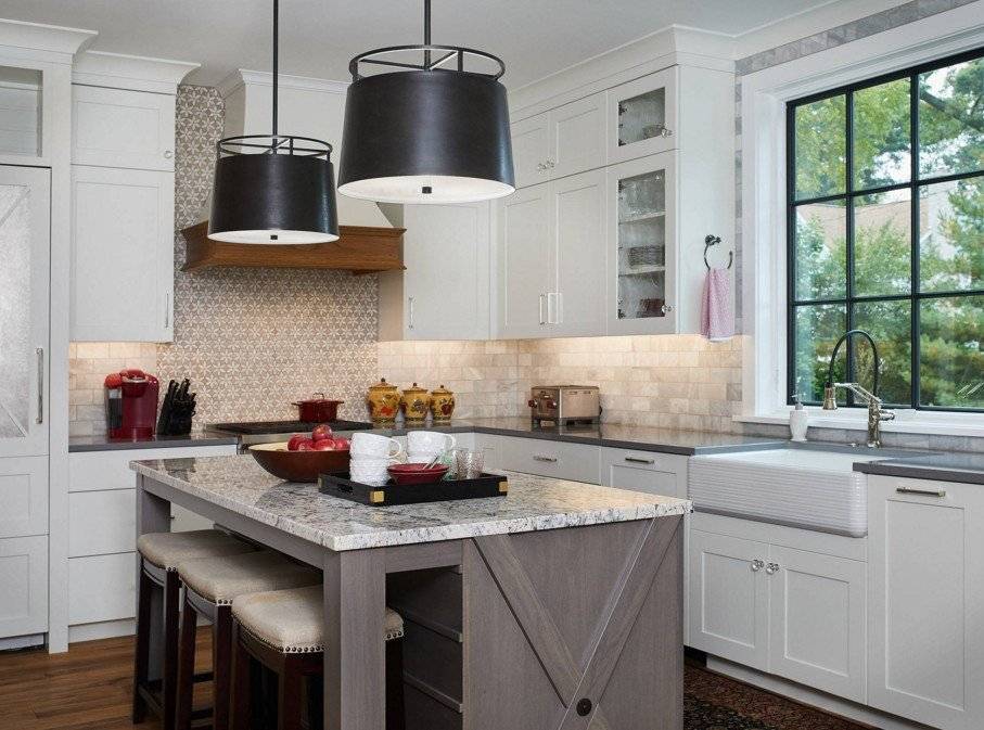 Фартук из плитки кабанчик, мозаикой, светло-бежевый или белый. С ним рабочая зона выглядит стерильно, уютно. Дополнительно снабжается рейлингами на которых размещается винтажная кухонная утварь.