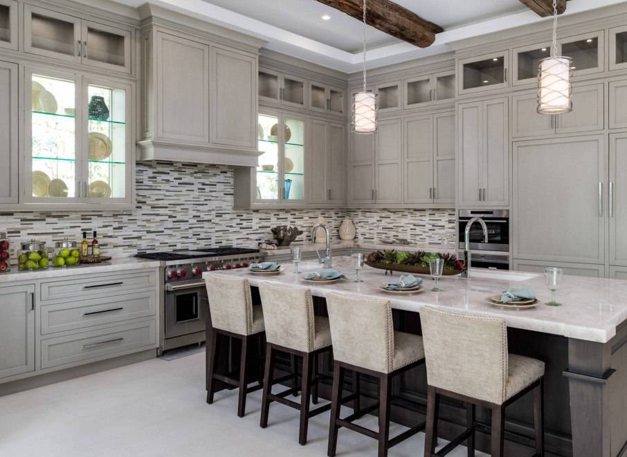 Фасады кухонного гарнитура немного потертые, выкрашены в один цвет, могут дополняться патиной, с узорчатой или прямой фрезеровкой. Уместны вставки с решеткой из деревянных брусьев или со стеклом.