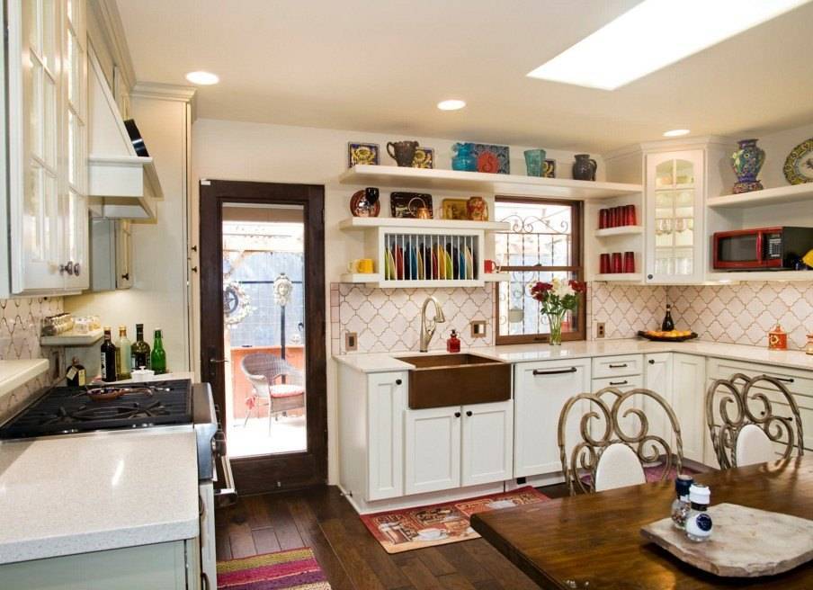 - всю мебель необходимо расставить по периметру, в этом случае мойку лучше поместить под окно, мебель должна быть угловая, с большим количеством открытых полок;