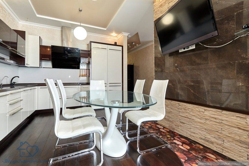 Если подобран стиль арт-деко, то подойдет к нему круглый стол приятного молочного цвета или праздничный белый стол. Но выбор цвета обязательно должен перекликаться с цветовой гаммой кухонного гарнитура либо отделкой помещения.