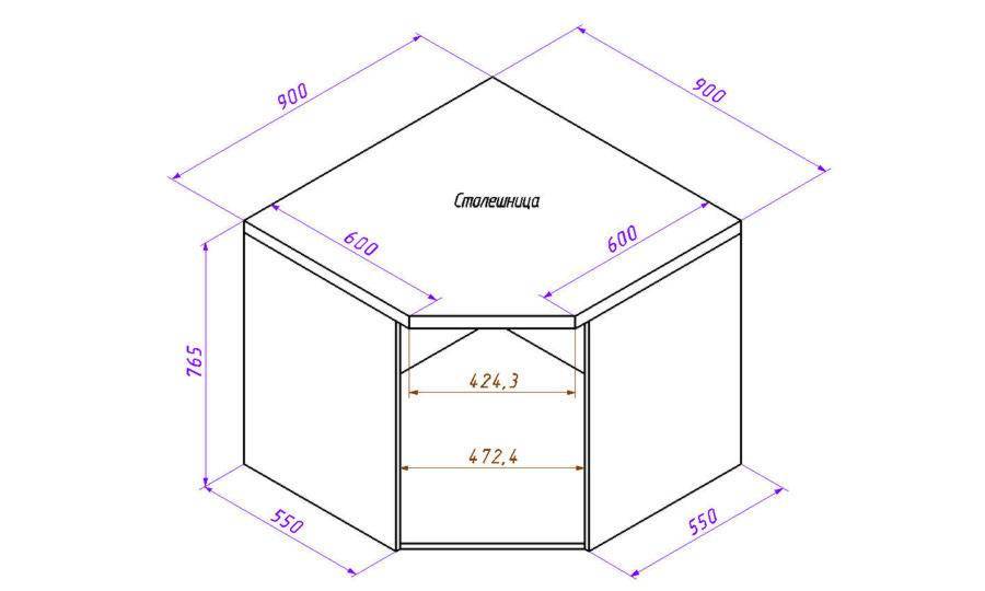 Рис.3. Угловой шкаф кухни чертеж. С углом 135 градусов.