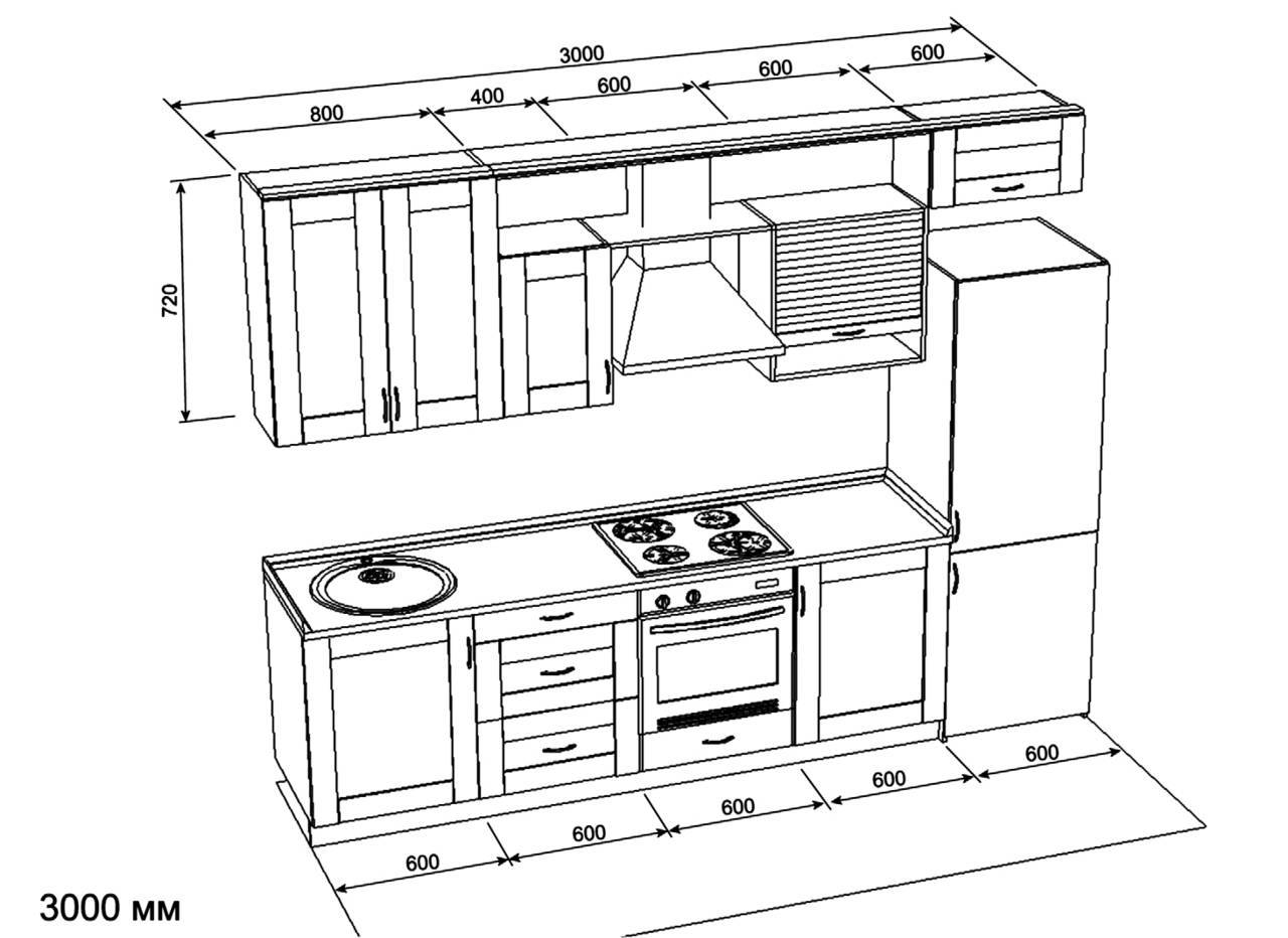 Рассмотрим дизайн-проект прямой кухни длиной 3 метра. Обычно при прямолинейной расстановке кухонной мебели требуется предусмотреть зону установки мойки, плиты и холодильника – трех ключевых элементов кухни. Пусть в нашем случае холодильник не входит, нужна прямая кухня своими руками ровно 3 метра. Тогда дизайн-проект прямой кухни своими руками может выглядеть примерно так.