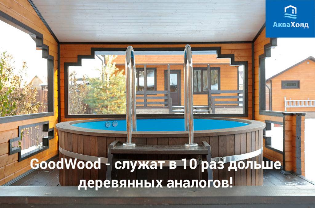 Уличная легковесная купель с хорошей вместительностью людей. Предполагает совместное использование с деревянной баней, установленной снаружи печью. Производителем выступает российский бренд «GoodWay».