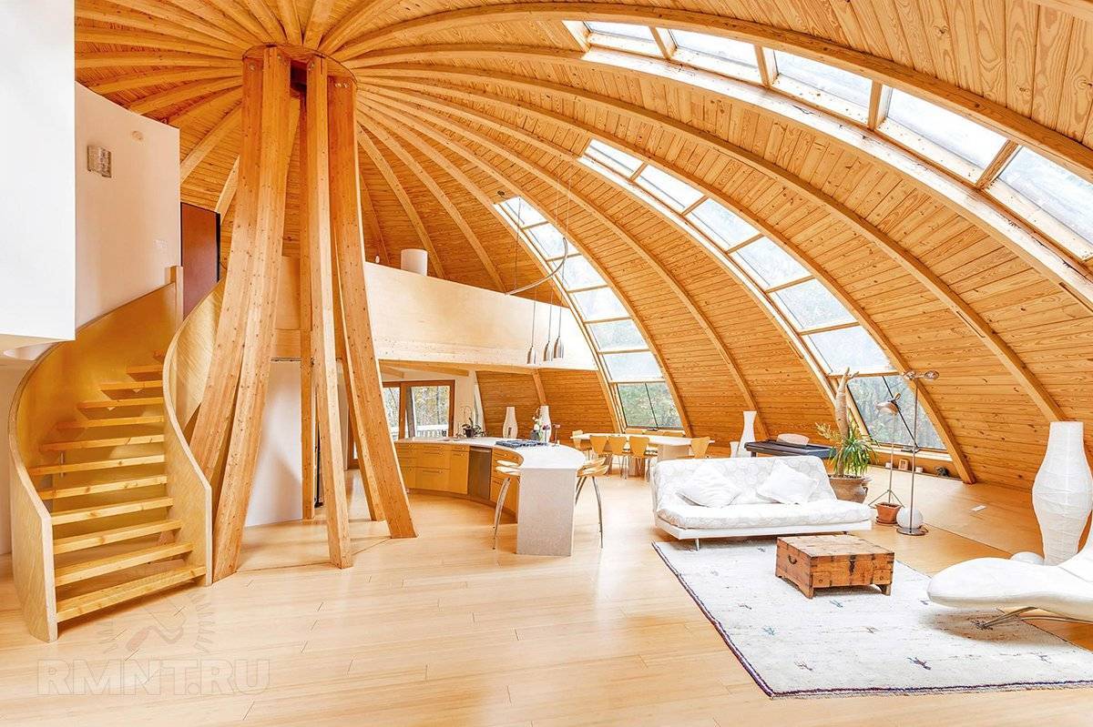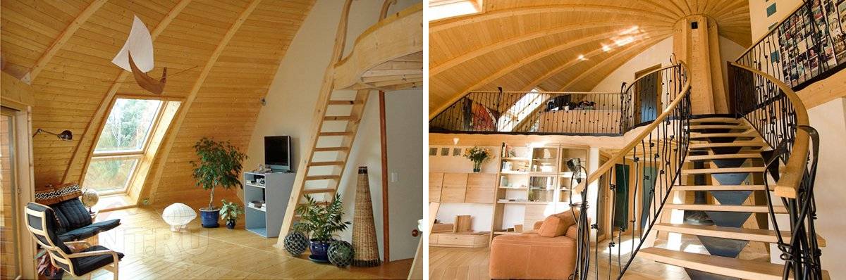 Если в доме больше одного этажа, по центру хорошо смотрится винтовая лестница, подчеркивая круглую форму строения. На втором этаже традиционно размещают спальни, индивидуальные помещения, кабинеты, библиотеки. Устроив в центре купола даже небольшой участок остекления, получают источник света днём и настоящее звёздное небо ночью