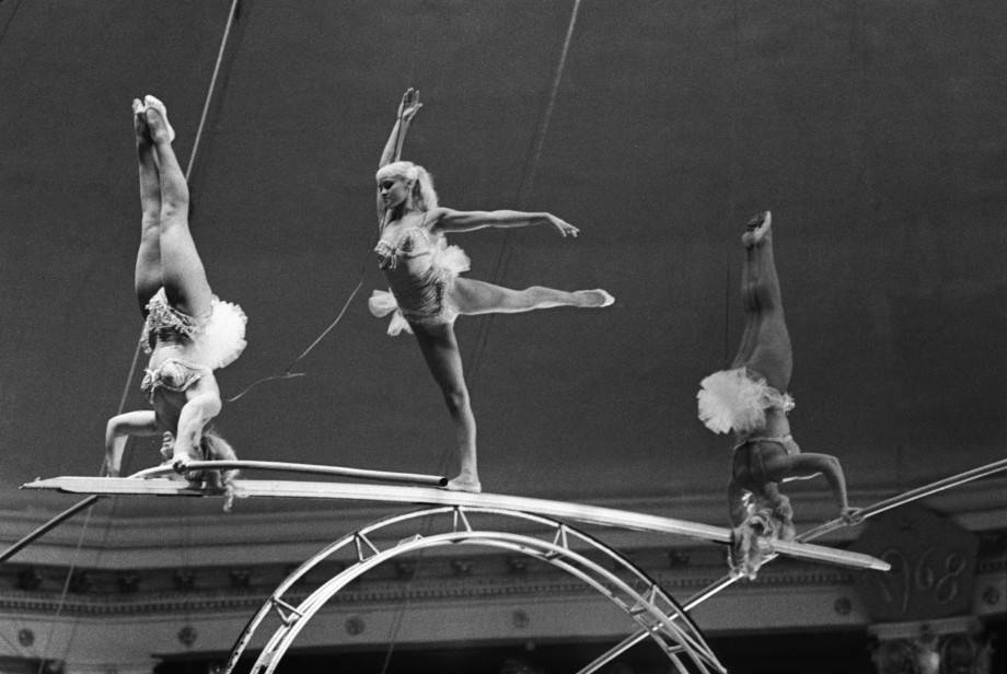 Советские эквилибристки Светлана Авдеева, Марта Авдеева и Наталья Савкина во время исполнения номера «Семафор-гигант». Фото: Виктор Великжанин/ТАСС