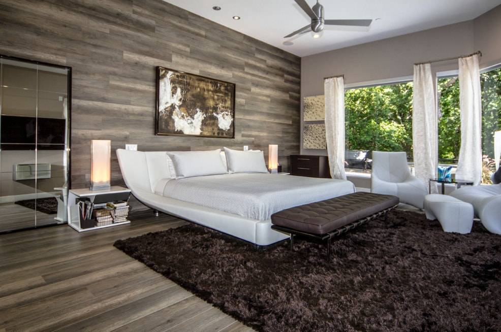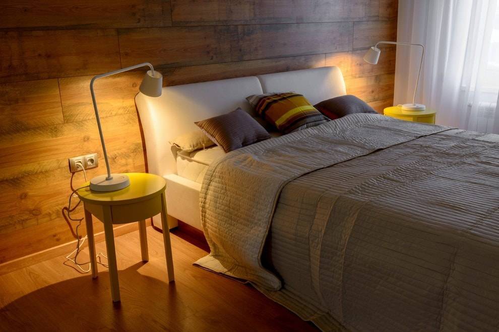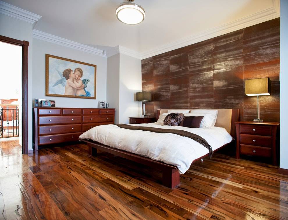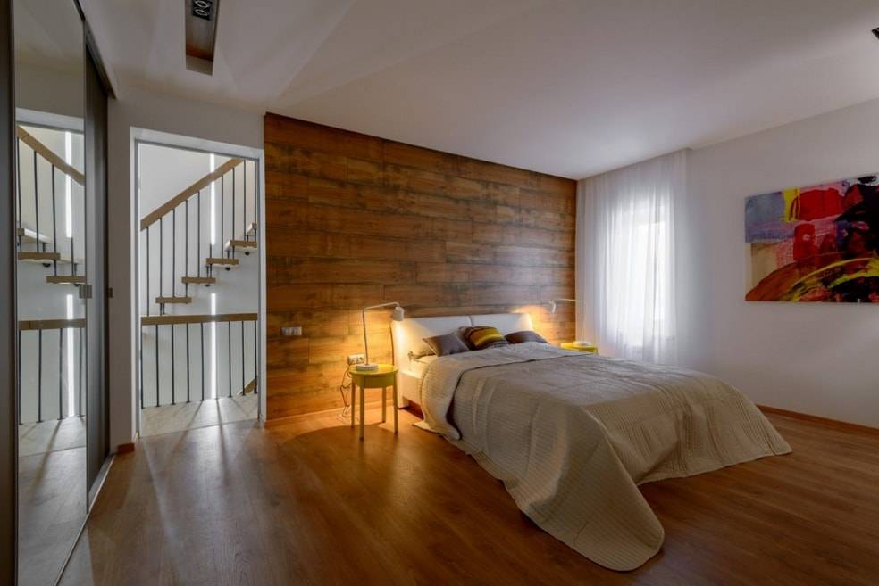 Можно отделать ламинатом акцентную стену; стильно оформить пространство за изголовьем кровати или за телевизором; визуально отделить одну функциональную зону в помещении от другой