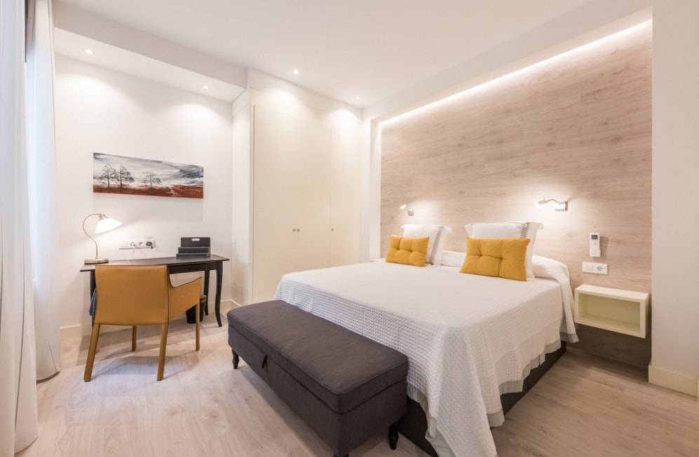 декор ниши в изголовье кровати ламинатом