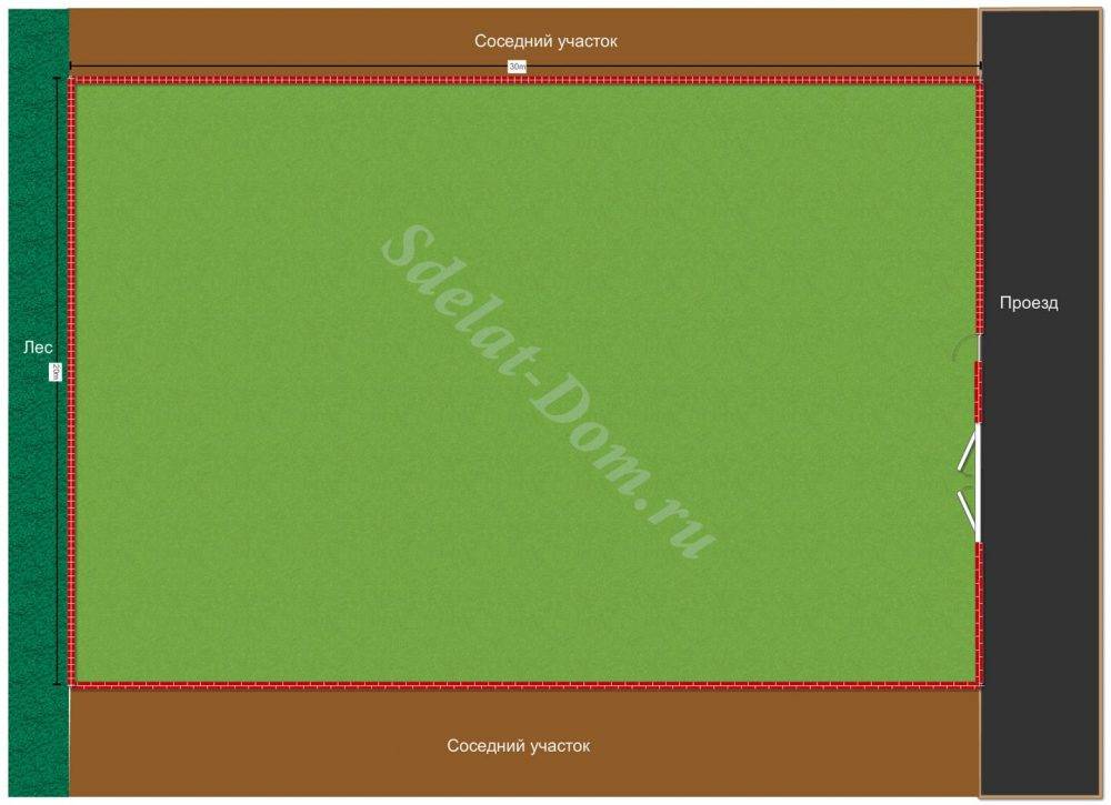 В нашем материале мы рассмотрим планировку стандартного дачного участка 6 соток размерами 30 м х 20 м. Такая прямоугольная форма наиболее часто встречается на практике.