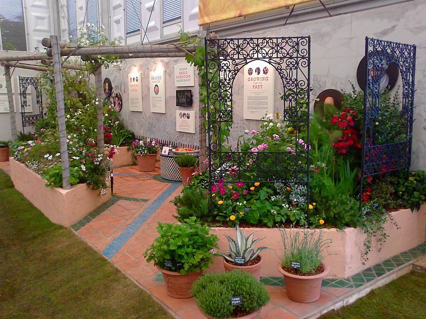 средиземноморский стиль подразумевает использование большого количества цветущих растений и декоративных кустарников, размещенных в маленьких вазах, горшках и кадках. Приветствуется установка разнообразных скульптур, фонтанов и прочих декоративных элементов. Обязательным является наличие столика с лавочками под небольшим навесом, укрывающим от солнца и дождя. Цветы могут быть самыми разными, лишь бы они сочетались друг с другом по оттенкам. Прекрасным дополнением станут миниатюрные фонари, превращающие палисадник по вечерам в уютное место для чайных церемоний;