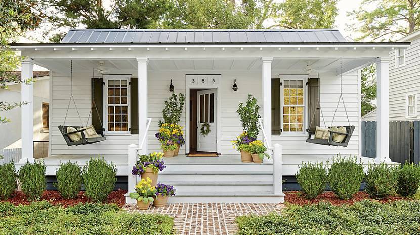 Минимализм. Этот стиль подразумевает сочетание современных технологий и практически полное отсутствие растительности. Если на участке имеется сад, то его необходимо оформить таким способом, будто за ним давно не ухаживали. Предпочтение отдают кованым элементам декора. Лестница, ведущая ко входной двери, может иметь пандус. Навес выполняется либо из металла, либо из стекла. Территорию перед домом облицовывают плиткой или природным камнем. Создают искусственное освещение. В качестве зелёных участков часто используют можжевельник, барбарис или спирею.