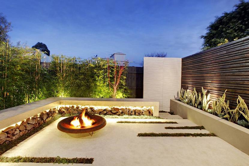 Большое патио с железной костровой чашей и подсветкойИсточник m.jindingaus.com