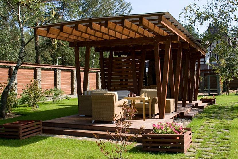 Стильная беседка с террасой из натурального дерева посреди газонной поляныИсточник studiofmp.com