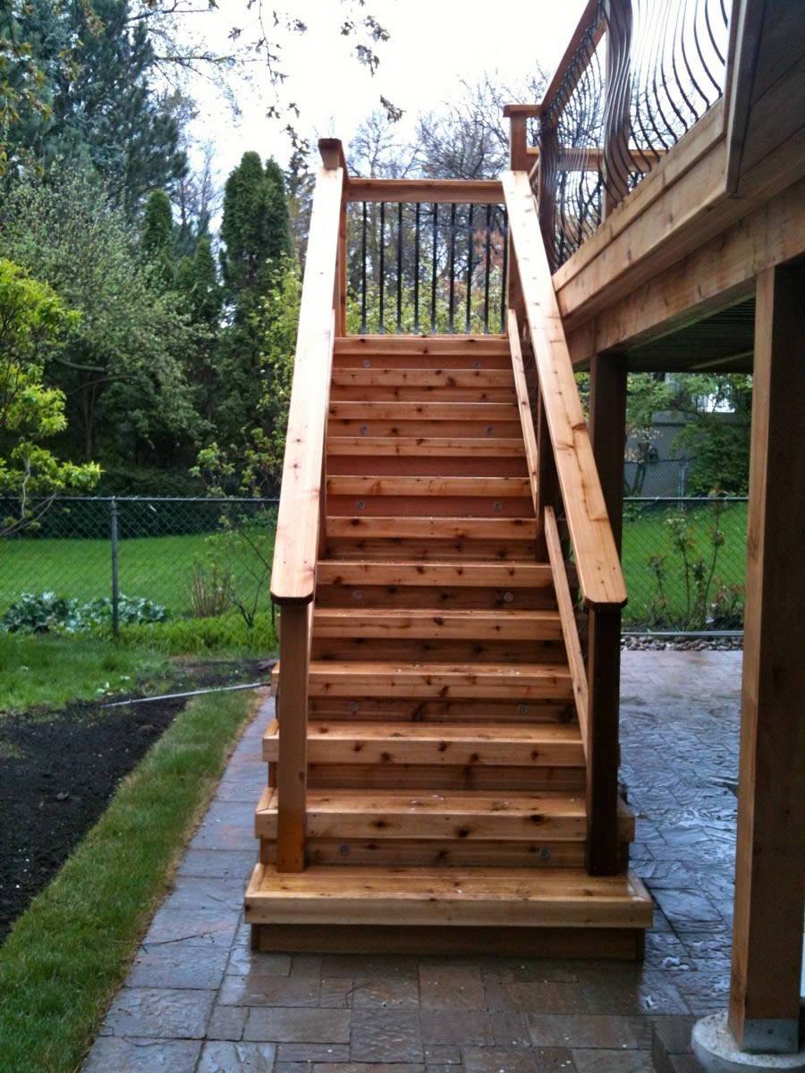 Помимо лиственницы и дуба, для обустройства лестницы на террасу подходят экзотические породы в виде секвойи, тика или мербау. Стоимость последних несравненно выше, нежели привычных для наших широт деревьев. Независимо от происхождения, используют древесину с низким процентом влажности, иначе в процессе высыхания конструкция для террасы деформируется.