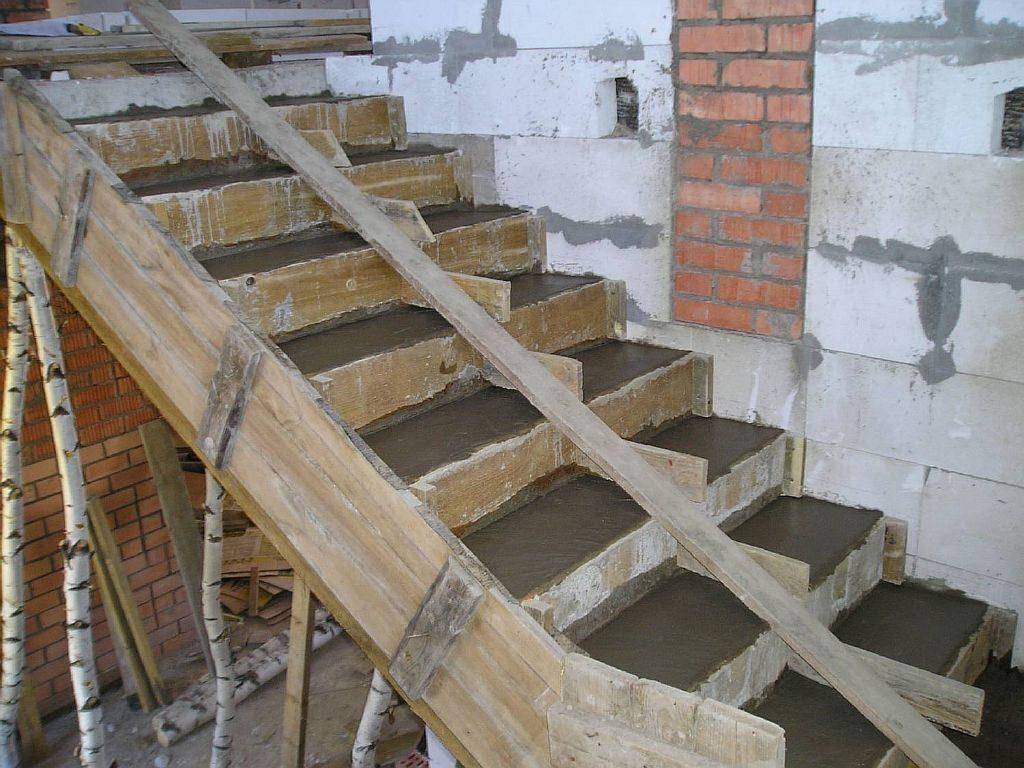 Изготовление бетонной лестницы по технологии похоже на заливку крыльца бетоном. Прежде чем приступить к основному этапу работ, строитель должен сделать все необходимые расчеты: количество ступеней, их высоту и нагрузку, которую они могут выдержать. Для того чтобы бетонная конструкция была надежной, следует заняться изготовлением каркаса.