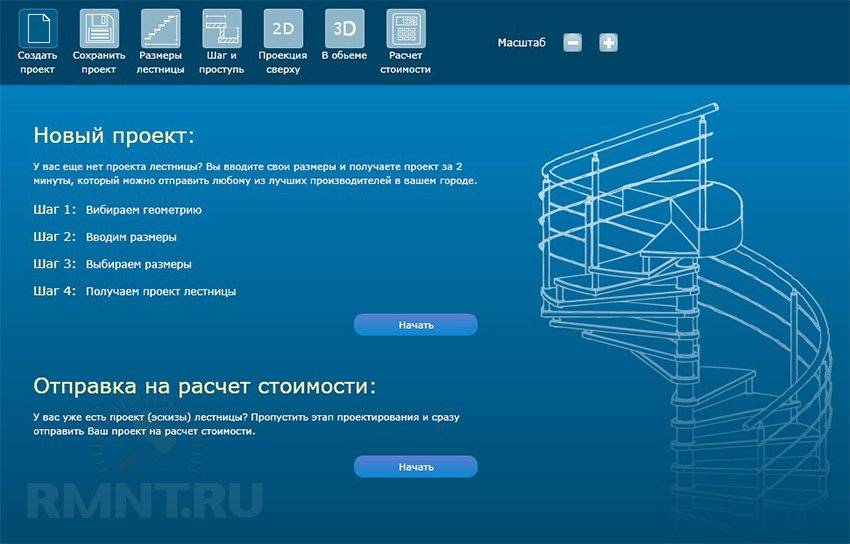 Начать знакомство с программами для конструирования лестниц следует со всевозможных online-сервисов и калькуляторов. Их возможности сильно ограничены веб-платформой: хотя и существуют способы осуществить подробные расчёты и качественно визуализировать изделие «не выходя из интернета», разработка подобных программных средств стоит слишком дорого и практически никогда не оправдана.