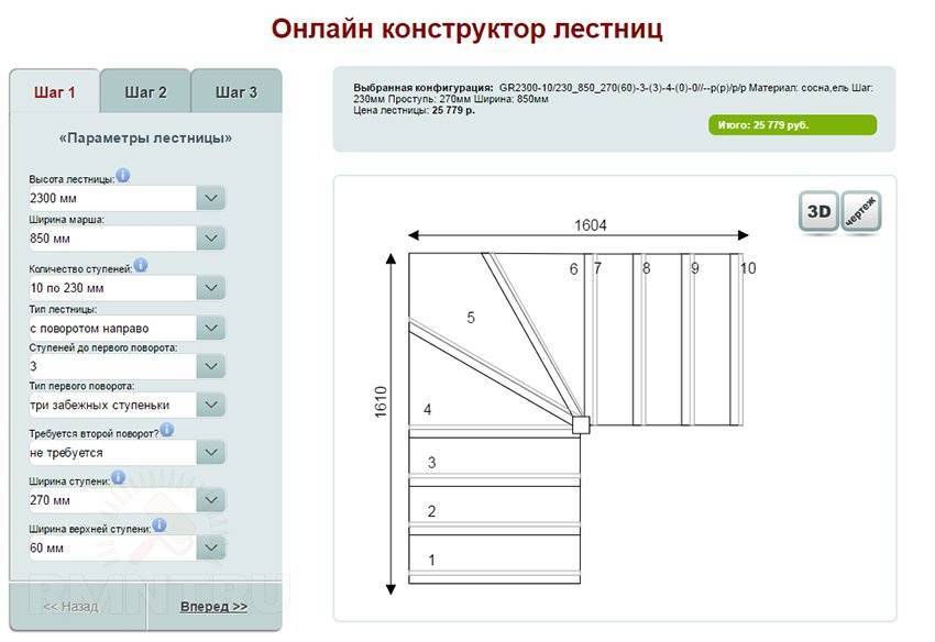 Еще один популярный сайт — lascalagrande.ru. Здесь не доступен свободный ввод параметров, но форма параметризации достаточно «умная» и сама предложит допустимые варианты на выбор пользователя. Есть возможность выбрать один из шести типов лестниц (включая многомаршевые, поворотные и со сложной формой ступеней), а также рассчитать ограждения и баллюстрады, получив в итоге чертёж с основными размерами и изометрический эскиз. Сайт stairshop.ru — это практически полный аналог предыдущего, но в нём есть редкая возможность трёхмерного обзора спроектированной лестницы, хотя и с весьма примитивным качеством отображения.
