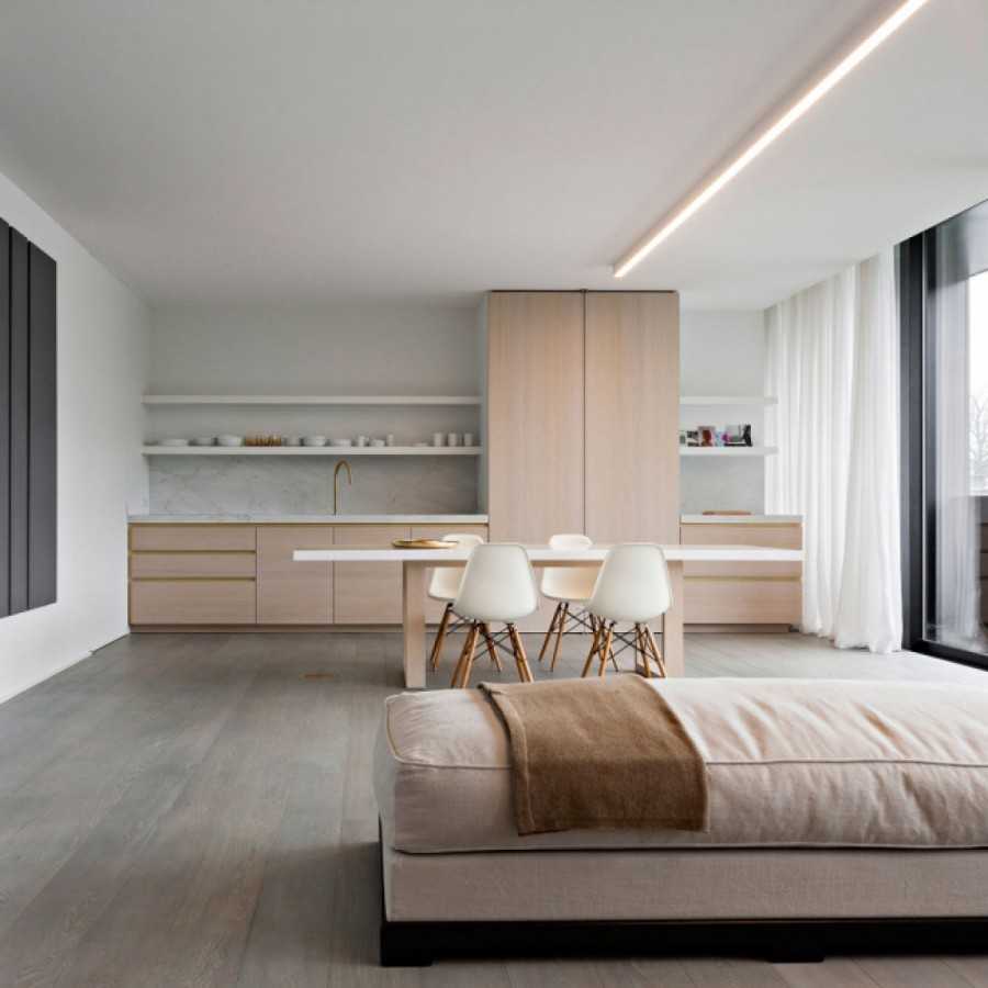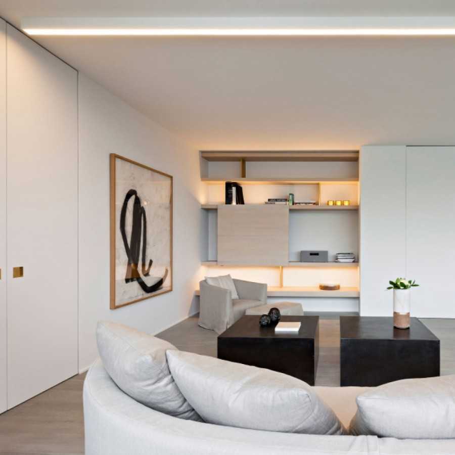 Очень хорошо сочетаются парящие линии для натяжных потолков, фото, с минималистичным дизайном помещения.