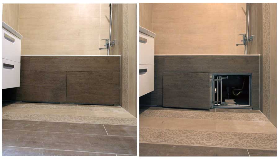 Ее отделывают тем же материалом, что и стены. Размеры люка под ванну могут быть меньшими, чем для установки в ревизионную нишу в стене. Скрытую модель обычно отделывают кафельной плиткой и монтируют до того, как будет закончена финишная отделка стен.