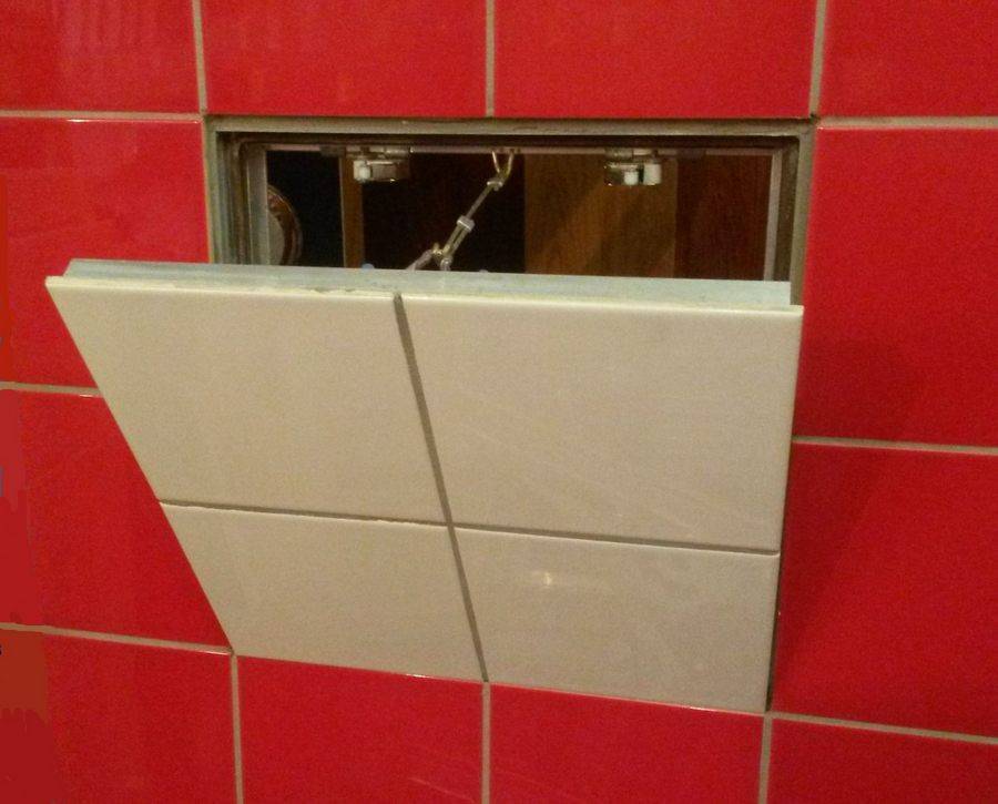 Проем для доступа к коммуникациям и приборам учета можно оформить по-разному. Ревизионное окно может оставаться видимым и самостоятельным элементом дизайна или быть замаскированным под облицовочный материал. Конструкцию второго типа называют «скрытый сантехнический люк». Эти сантехнические изделия могут быть заводского или собственноручного изготовления.