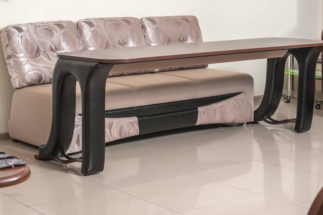 Маленькая модель дивана-трансформера на кухню, в сложенном виде – диванчик с подлокотниками, при раскладывании образующий кушетку без спинки и столик. Для тесной кухни это самый лучший вариант, так как покупка отдельного обеденного стола не требуется.
