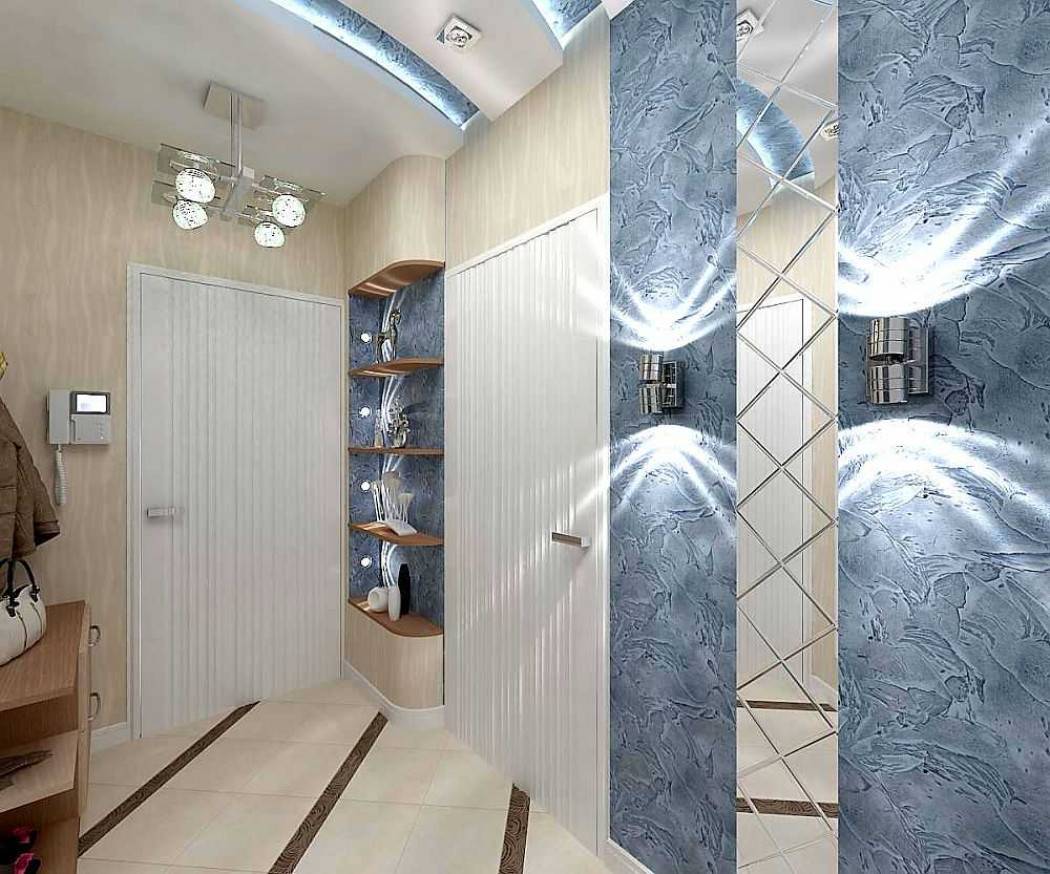 По советам дизайнеров оптическое расширение можно сделать за счёт больших зеркал, фасадов и декора из стекла или прозрачного пластика. Свет, пронизывающий зеркала, стеклянные поверхности, блики на глянце значительно облегчат тесную планировку. Игра света с помощью многоуровневого освещения с одним основным источником света и парой вспомогательных, прибавит узкому коридору простор, уют.