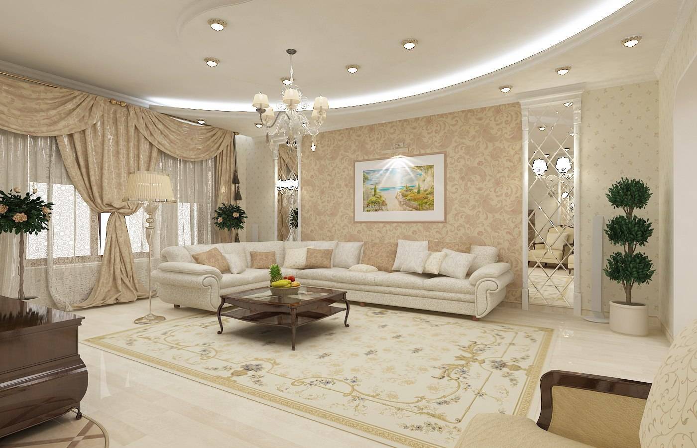 Если в спальне рекомендуют использовать нежное и не раздражающее взгляд матовое полотно, то в гостиной глянцевая ПВХ пленка будет смотреться намного лучше. За счет отражения в потолке комната будет визуально казаться больше. А приложив немного фантазии, можно создать самое настоящее зазеркалье.