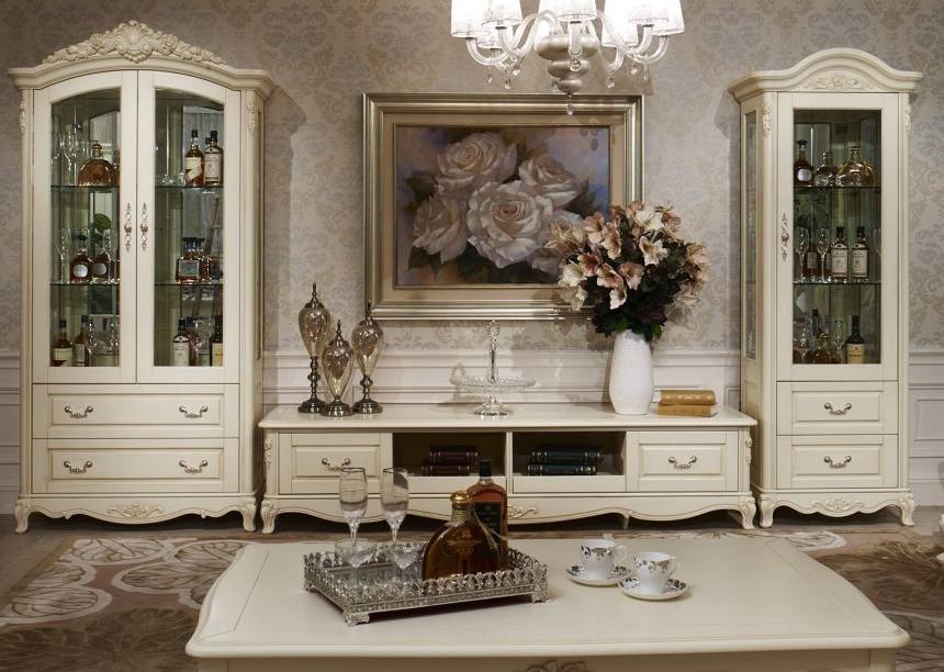 Классическая корпусная мебель в гостиную, выполненная настоящим мастером, имеет сложный рельеф и резьбу, украшена позолоченными деталями и изогнутыми ножками. Для работы используют дорогую древесину: черное или красное дерево, эвкалипт, яблоню.