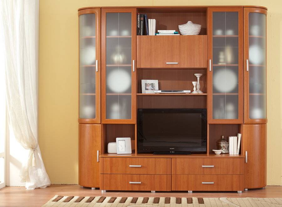 Собственный индивидуальный гарнитур покупатель может сформировать с комодом, полками, тумбами, столиками, платяным шкафом или двумя вещевыми отсеками, со шкафами по бокам. Вариантов великое множество. Модульный принцип позволяет гармонично совместить все это в пределах одного помещения. При разумном выборе даже стенка всего из трех элементов – с тумбой под телевизор и шкафами по бокам, может смотреться без излишней тяжеловесности и в то же время очень уютно.