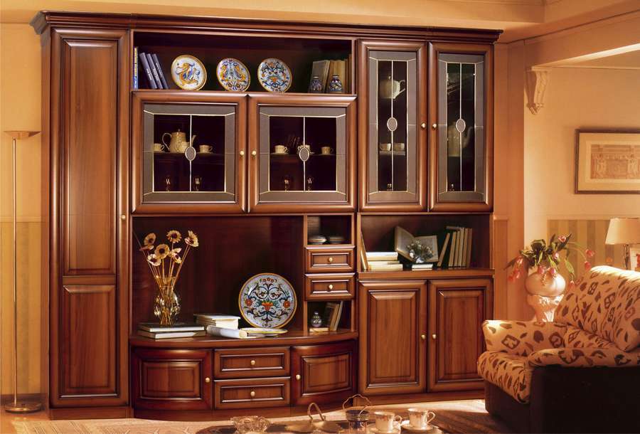Классика. Классическое направление интерьера будет уместно лишь в том случае, если гостиная в вашем доме широкая и свободная, потому как мебель классического образца требует много места в помещении. В таком случае грузноватая вальяжная стенка будет презентабельно выглядеть. Красочная палитра оттенков классицизма наполненная, органичная, но не броская. Допустимы ровные очертания, ясные геометрические формы.