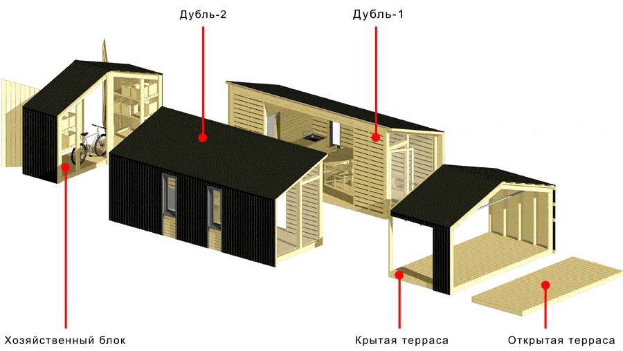 Каждый модуль такого дома представляет собой каркасную конструкцию из: