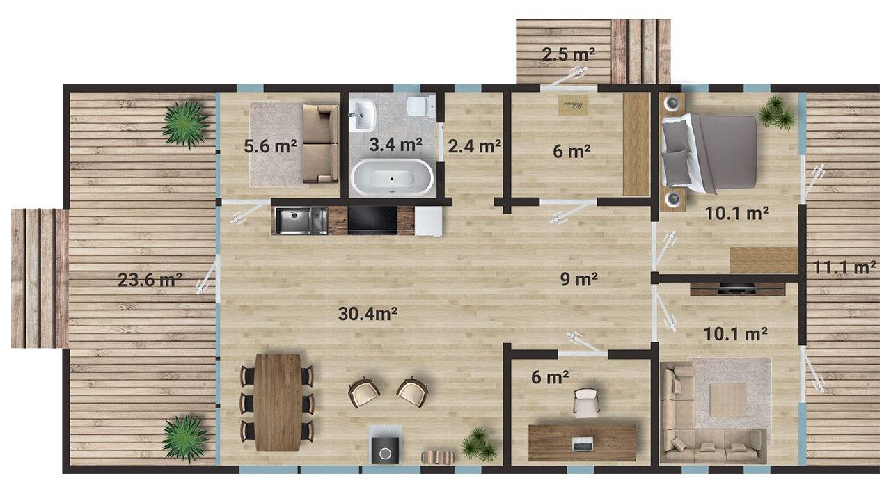 Планировка и дизайн модульных домов, отвечает тенденциям архитектуры, и технологиям строительства. Современные отделочные материалы в сочетании с натуральным деревом, элементами из металла и камня, делают модульные дома комфортными для круглогодичного проживания.