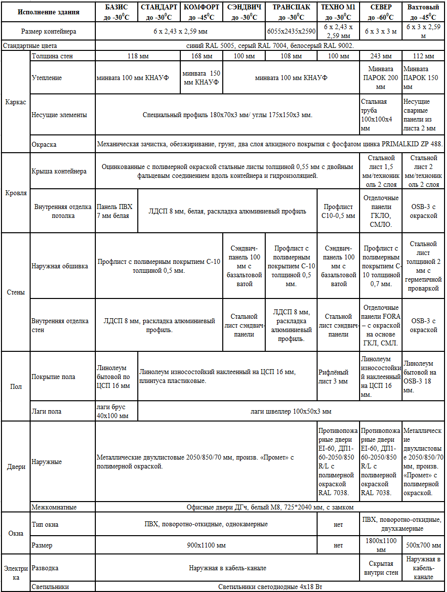 В таблице приводим сравнительные технические характеристики модульных зданий РосМодуль в стандартном исполнении для обычных условий эксплуатации.