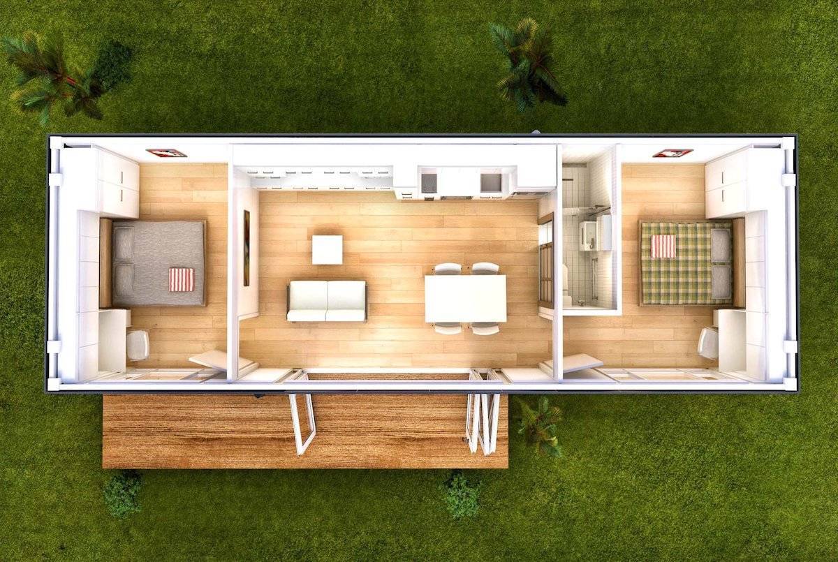Небольшой домик из одного контейнера площадью вполне вмещает все необходимое для полноценного проживания в нем. В нем можно обустроить спальню, кухню и санузел, разделив жилой блок на отдельные зоны.