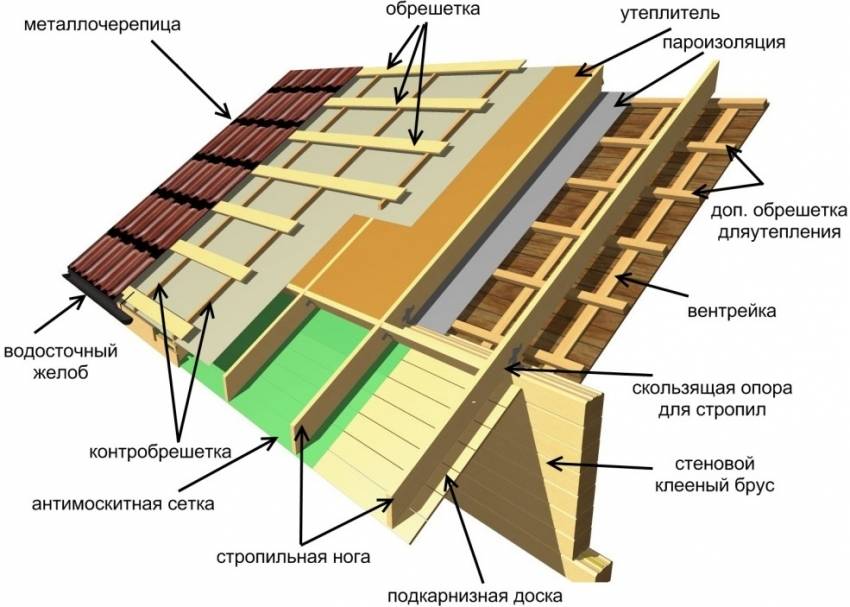 Движение воздуха обеспечивает обрешетка для металлочерепицы, которая создает достаточный зазор между слоями и гарантирующей отсутствие точек соприкосновения.