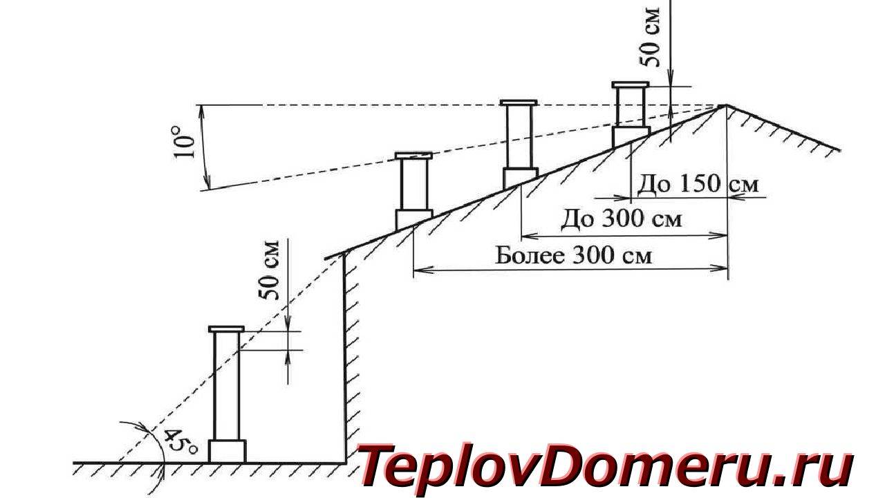 - Если крыша скатная, то верхний край конструкции должен располагаться на расстоянии от конька, равном минимум 0,5 м. Но это актуально в случае, если середина трубы находится от конька примерно в полутора метрах и менее.