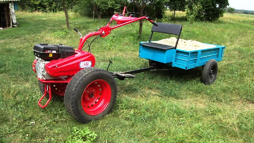 Навеска подключается на сцепное устройство, которое располагается сзади машины. Агрегат предназначен для различных работ: вспашка целины, посадка и сбор урожая, а также для перевозки грузов. В отличие от других бензиновых моделей, на МТЗ установлен полноценный ВОМ, как на тяжелых дизельных машинах.