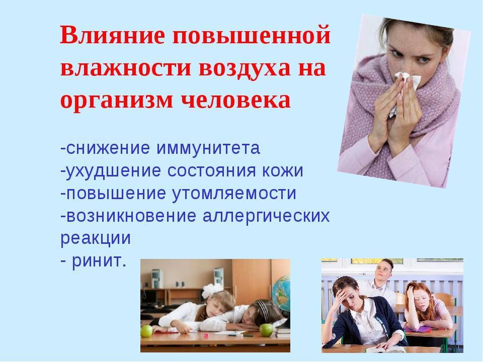 При высокой влажности и высоких температурах в летний период, люди чувствуют слабость, учащение пульса и температуры тела, что приводит к заболеваниям сердца и сосудов. Низкие температуры провоцируют переохлаждение организма, что ведет к простудным заболеваниям.
