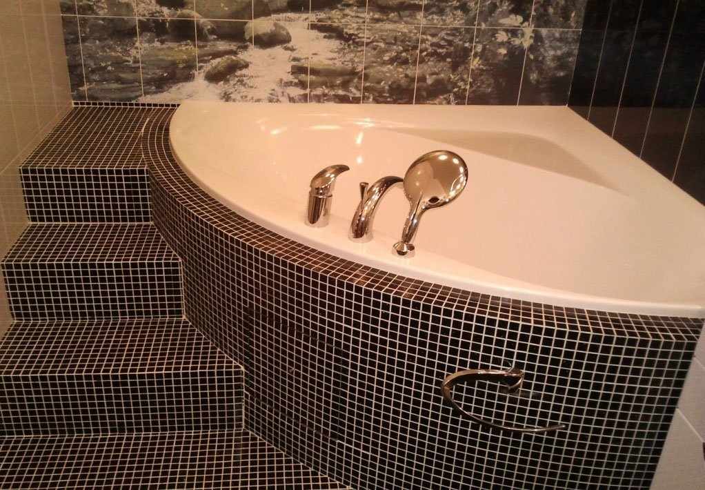 Если такая мозаика предназначена для декора бассейна, или ванны, выбирайте стеклянные или керамические виды. Применение такого кафеля для поверхности ванны – наиболее сложная и трудоёмкая работа из-за маленькой площади и плавных, округлых форм.