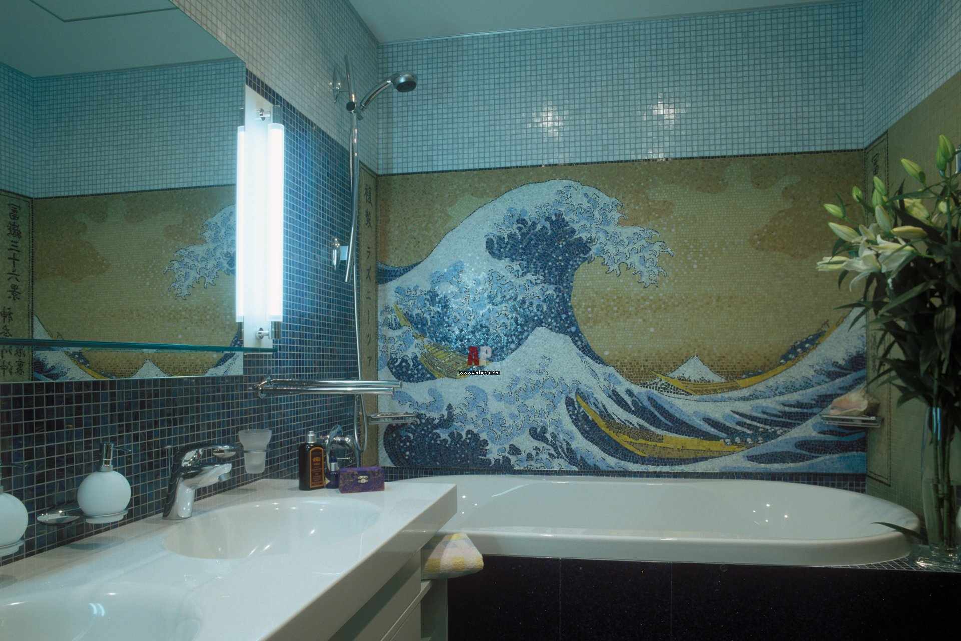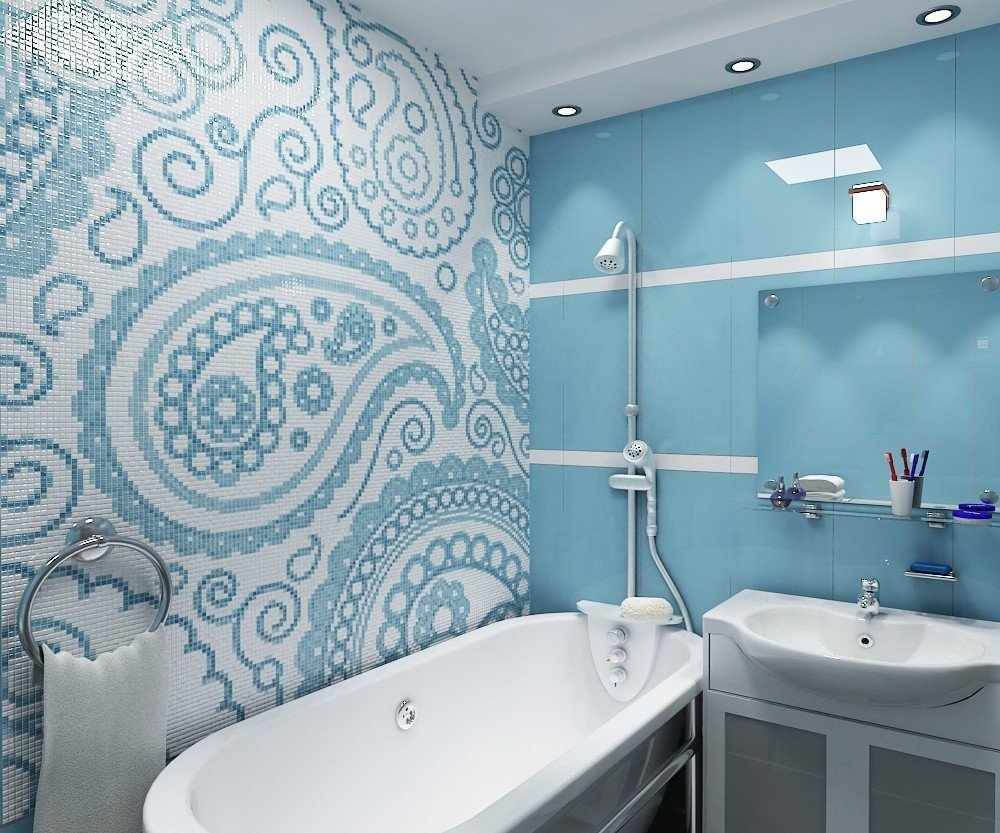 В том случае, если ванная не совмещена с санузлом, следует подбирать панно, тем самым разбивая пространство на зоны. Можно выложить комнату мозаикой в виде разноцветных волн.
