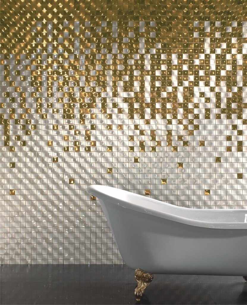 В ванной комнате уместно смотрится и металлическая плитка. Такая мозаика хороша тем, что в процессе попадания на нее лучей света она красиво мерцает. А если сделать большое панно из металлической мозаики, то она визуально увеличит комнату.