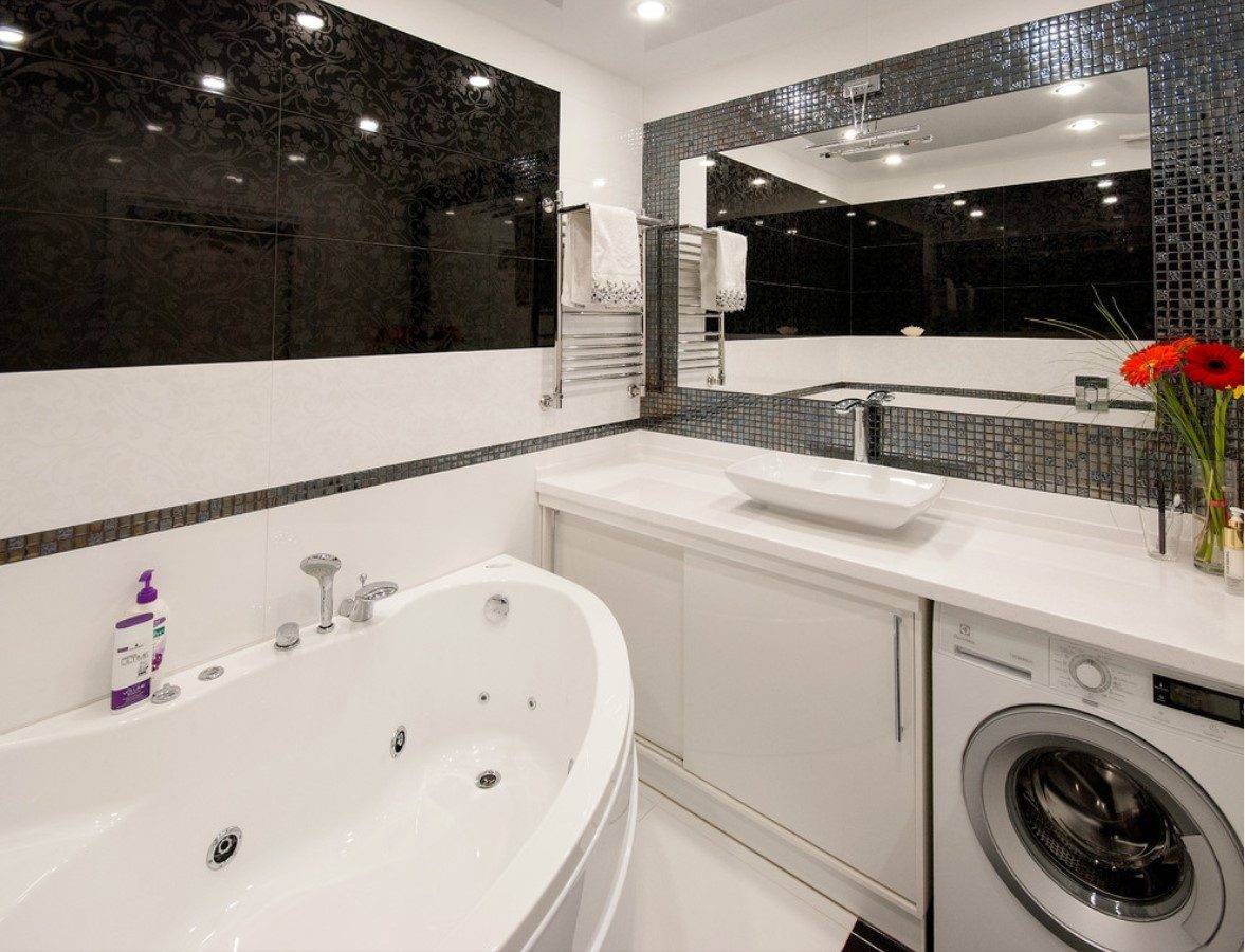 Однотонная плитка-мозаика, целиком покрывающая стены и пол, смотрится довольно уныло, какой бы яркой она ни была. Монохромные или контрастные мозаичные композиции оживляют интерьер и вносят элемент разнообразия.