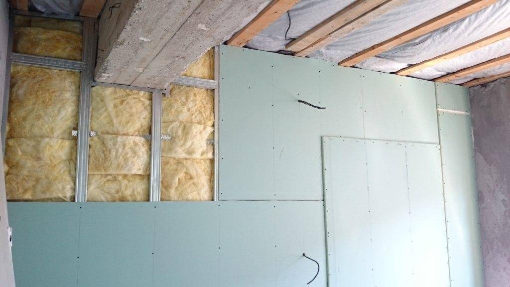 Гипсокартон можно использовать и при перепадах уровней поверхности от 20 до 40 мм, поклеив его прямо на стену при помощи специального клея. Однако наиболее распространённым и технологически правильным является метод монтажа ГКЛ на специально собранный каркас из профиля. Это делается, когда нужно скрыть не только неровности, а и проложенные поверх по поверхности коммуникации (трубы, электрические кабели, вентиляционные шахты и т. д.).