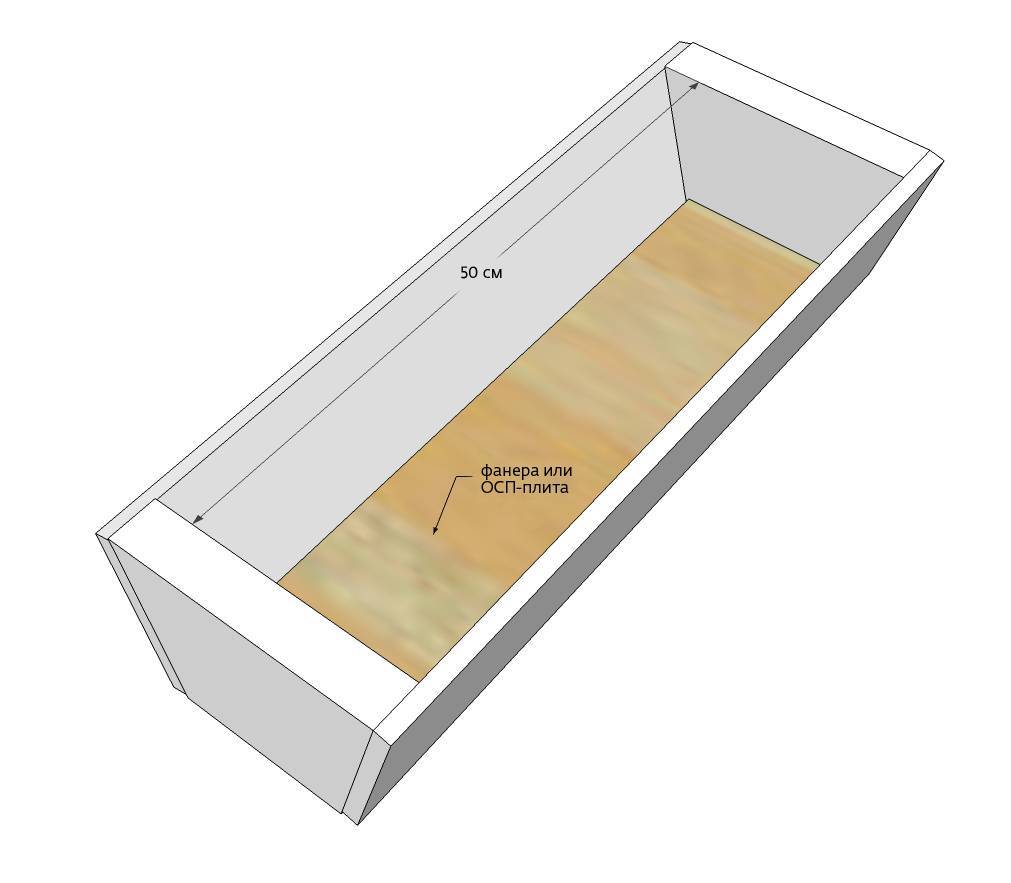 Теперь, когда каркас чаши готов, необходимо подготовить дно. Для этого лучше всего использовать ОСП листы, отличающиеся высокой степенью защиты от воздействия агрессивных природных факторов, либо предварительно обработанную фанеру. Контур дна чаши показан на фото ниже и представляем собой прямоугольник со сторонами 14,5 и 55 см.