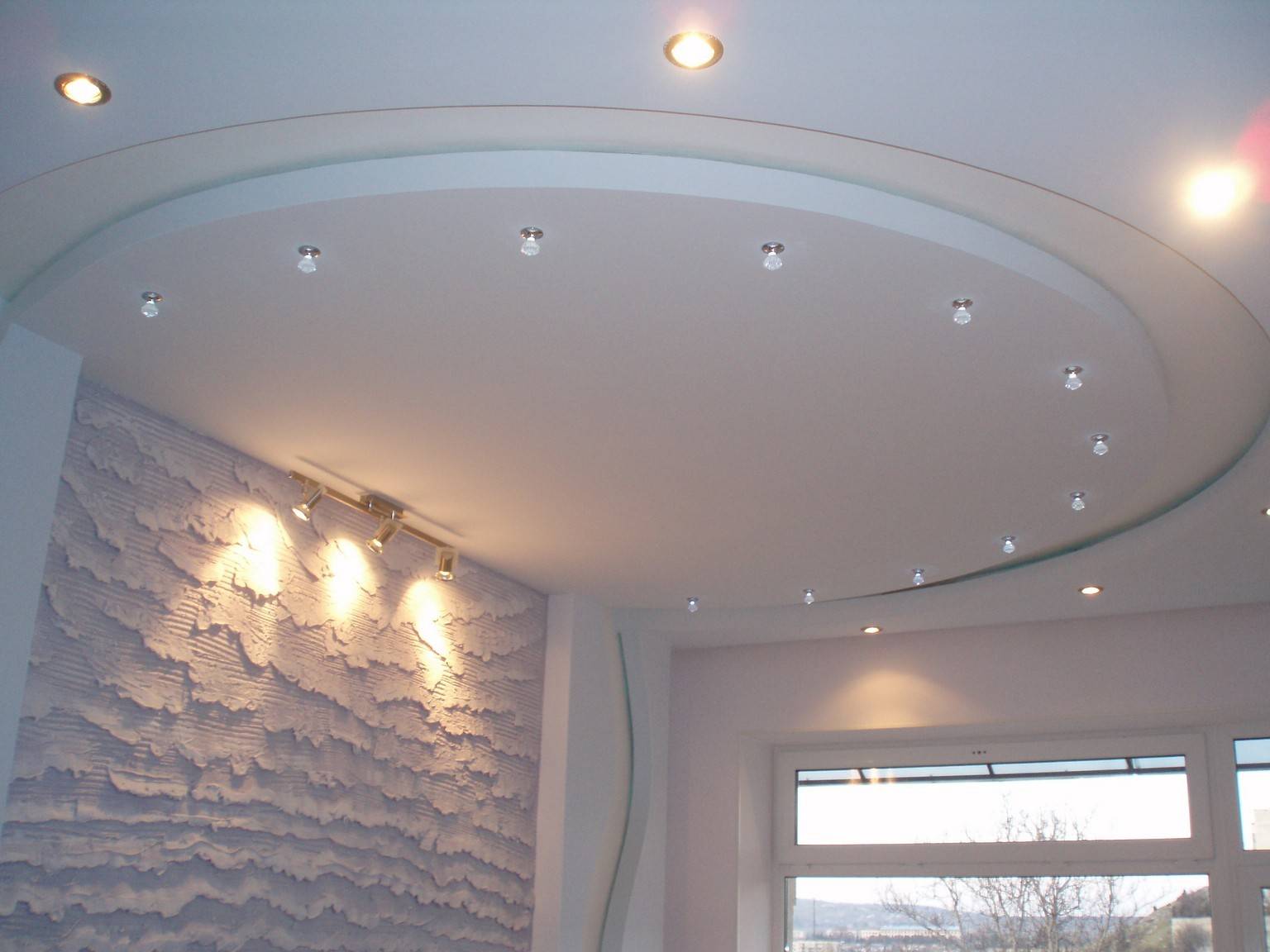 Точечные светильники, расположенные по периметру каждого яруса, способны сделать композицию завершенной и помогают в создании очертания элементов. Игра осветительных приборов помогает создавать неповторимые изделия, которые состоят всего из двух уровней. Каждому гостю понравится имитация космического корабля в гостиной комнате, где он сможет погрузиться в особую атмосферу.